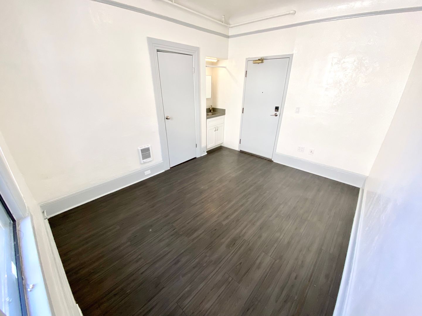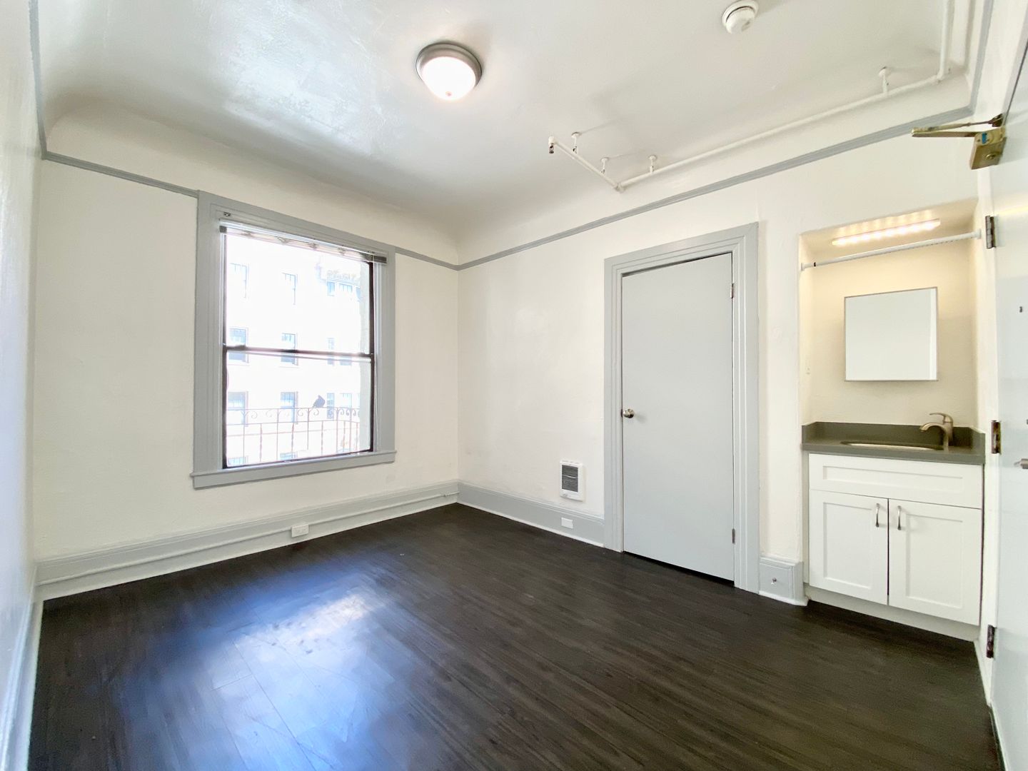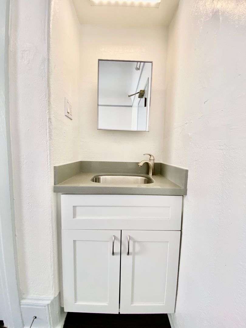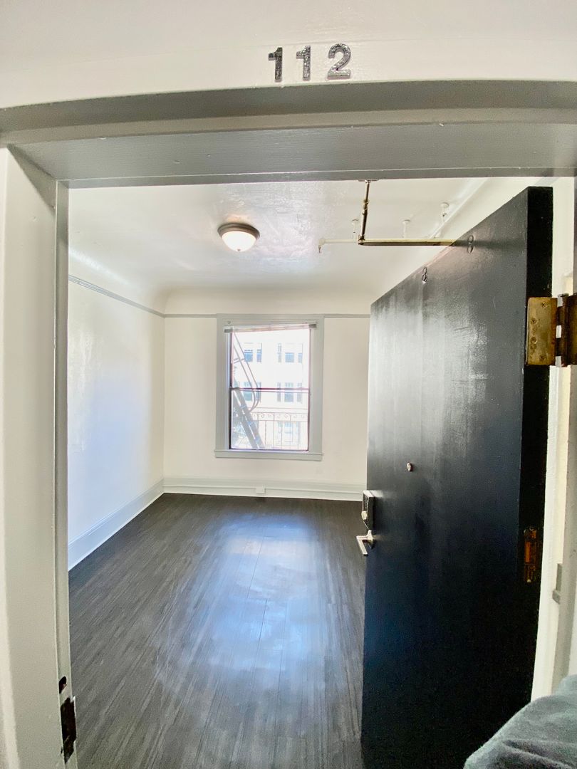 1010 Bush St., #112 is a cozy and comfortable studio apartment featuring a vanity with sink, and a good-sized closet providing convenience and storage space. The window on the far wall allows fresh air and natural light to flow into the unit, creating a bright and airy atmosphere. The wall-mounted heater ensures that the unit stays warm during colder months. The recent cleaning and fresh painting make the unit ready for immediate move-in, making it an ideal option for those looking for a comfortable and hassle-free living arrangement.