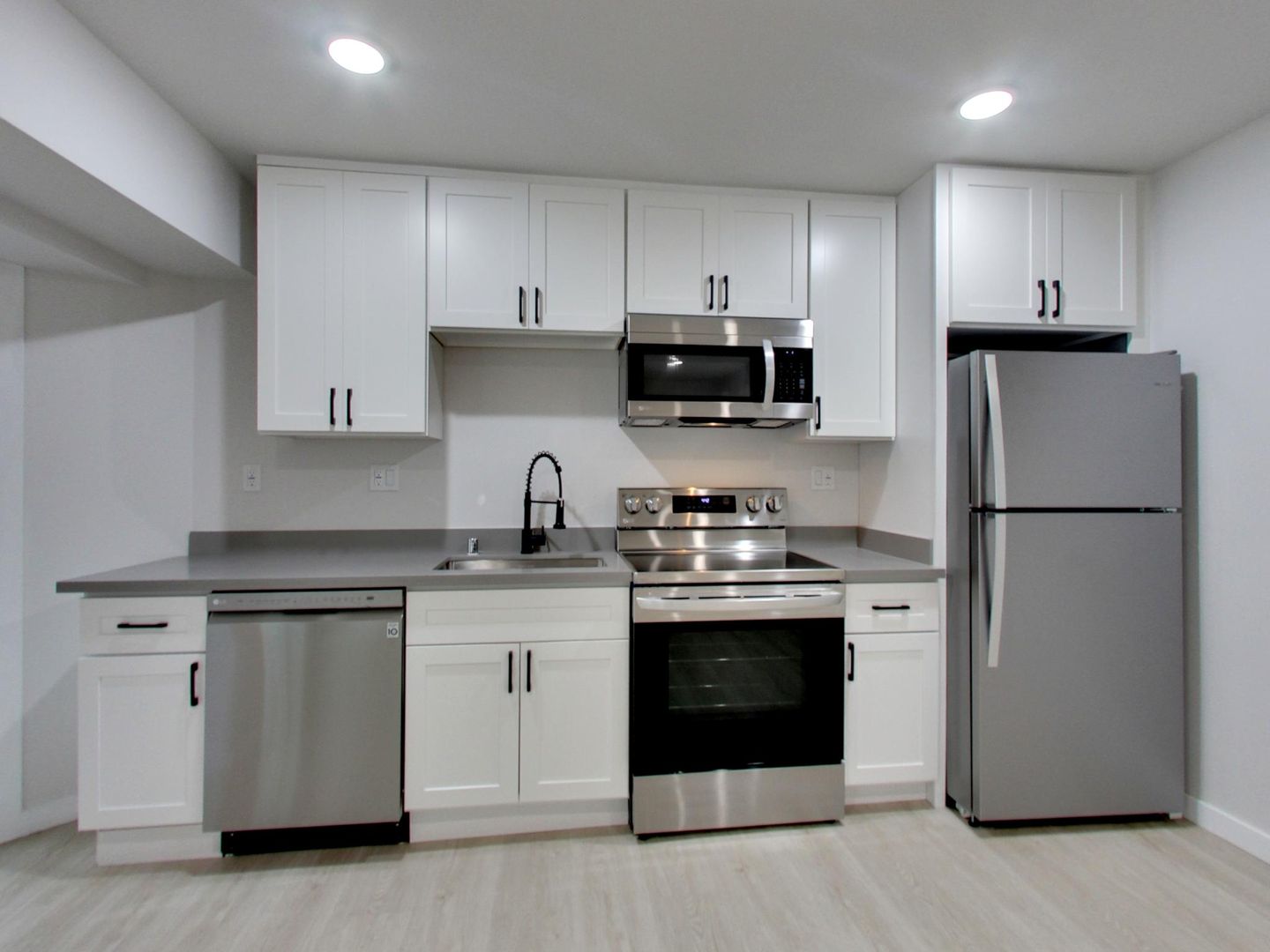 The open-concept kitchen is a chef's dream, featuring sleek granite countertops, pristine white cabinets, and brand-new, full-size, matching stainless steel appliances. From the dishwasher to the gas stove/oven, refrigerator, and microwave, everything you need for culinary mastery is at your fingertips. The kitchen effortlessly blends with the adjacent living space, which offers plenty of room for both a dining option or a desk, as well as a cozy couch, perfect for relaxation and entertainment.