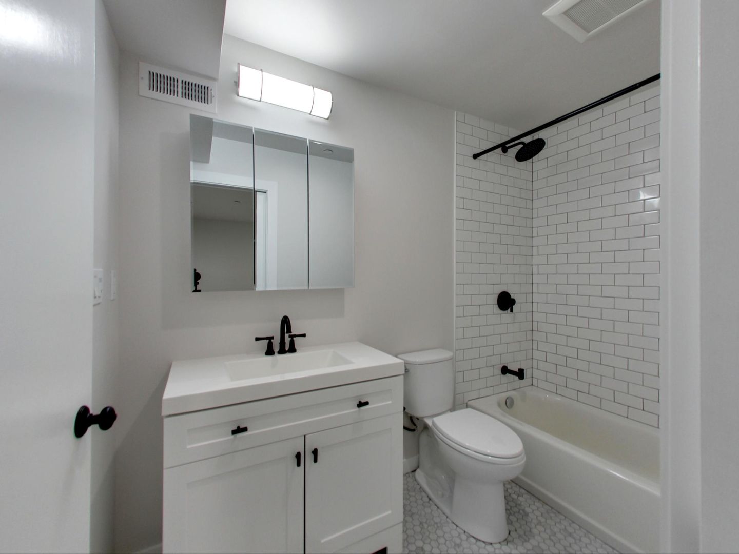 The bathroom is a sanctuary of style and functionality, showcasing a tub/shower combination with a rainmaker shower head and elegant white subway tiles along the wall of the shower. A modern vanity with storage underneath adds a touch of sophistication to your daily routines.