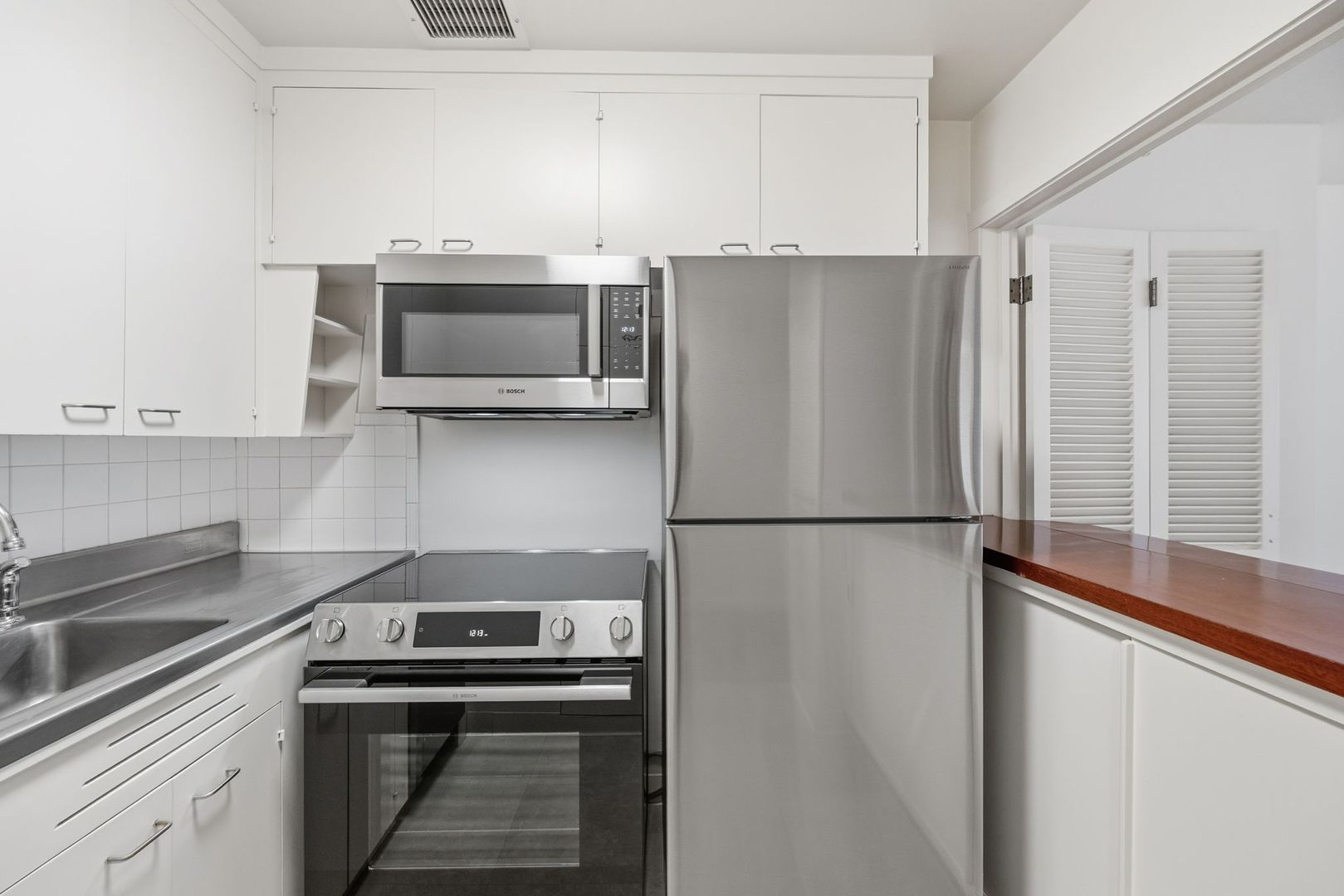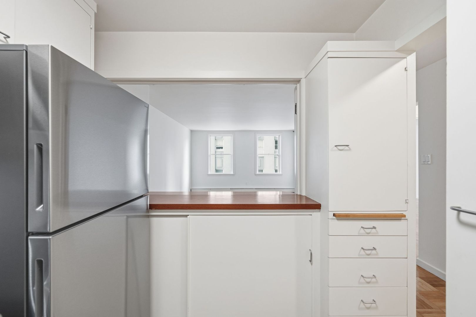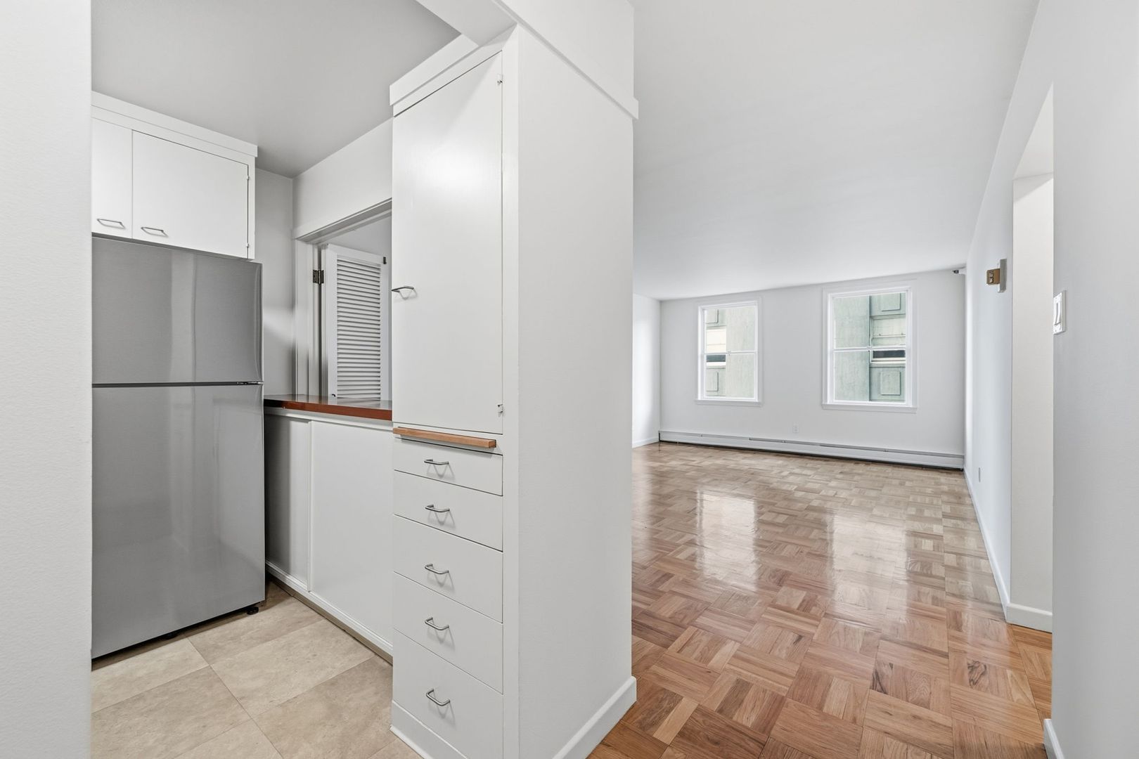 Hardwood floors run throughout the home, complemented by expansive windows in both the living area and bedroom that fill the space with natural light. The kitchen is elegantly appointed with matching stainless-steel appliances and offers room for barstools in front of the walk-up counter space, offering a seamless blend of form and function for both everyday living and entertaining. The bathroom features a beautifully tiled shower and tub combination with a timeless, clean finish.
