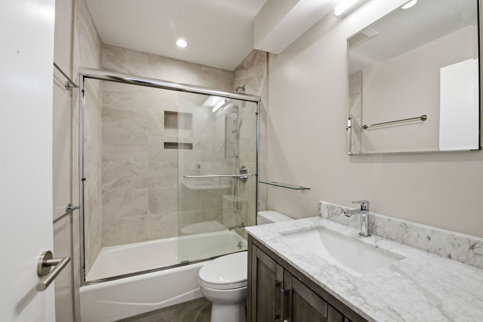 - Spa-like bathroom w/ shower over tub, heated floors & medicine cabinet.