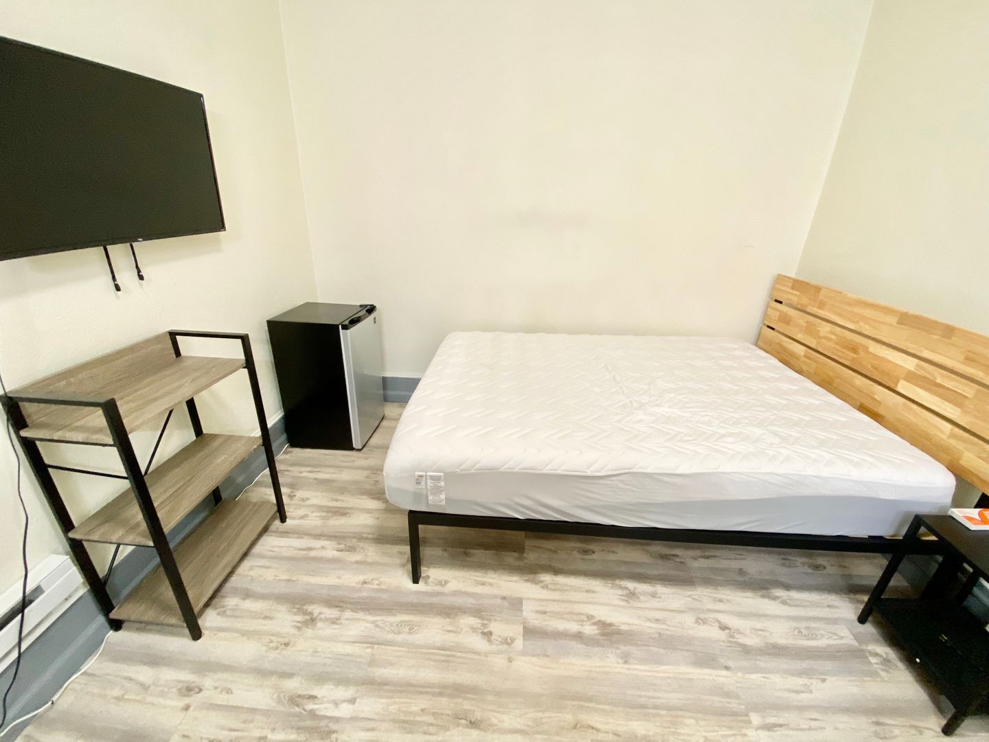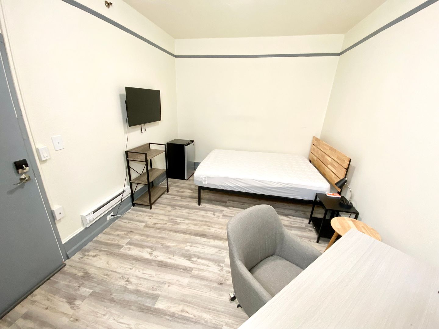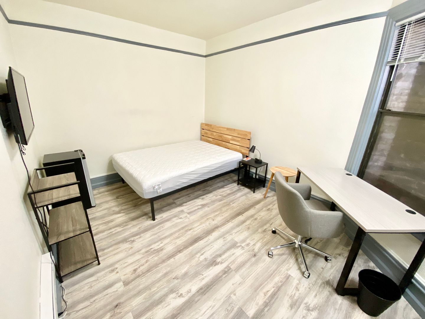 1010 Bush St., #128 is a cozy and comfortable furnished room that comes with all the essentials for the on the go person: a queen-size mattress with modern frame, nightstand, desk, chair, TV and mini refrigerator. There is also a vanity with sink, and a closet that provides storage space.