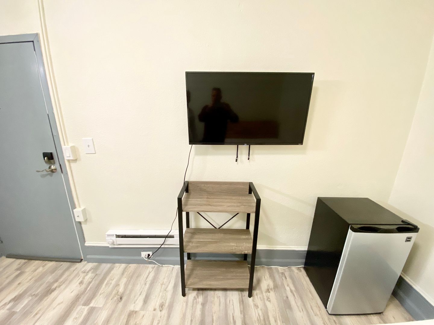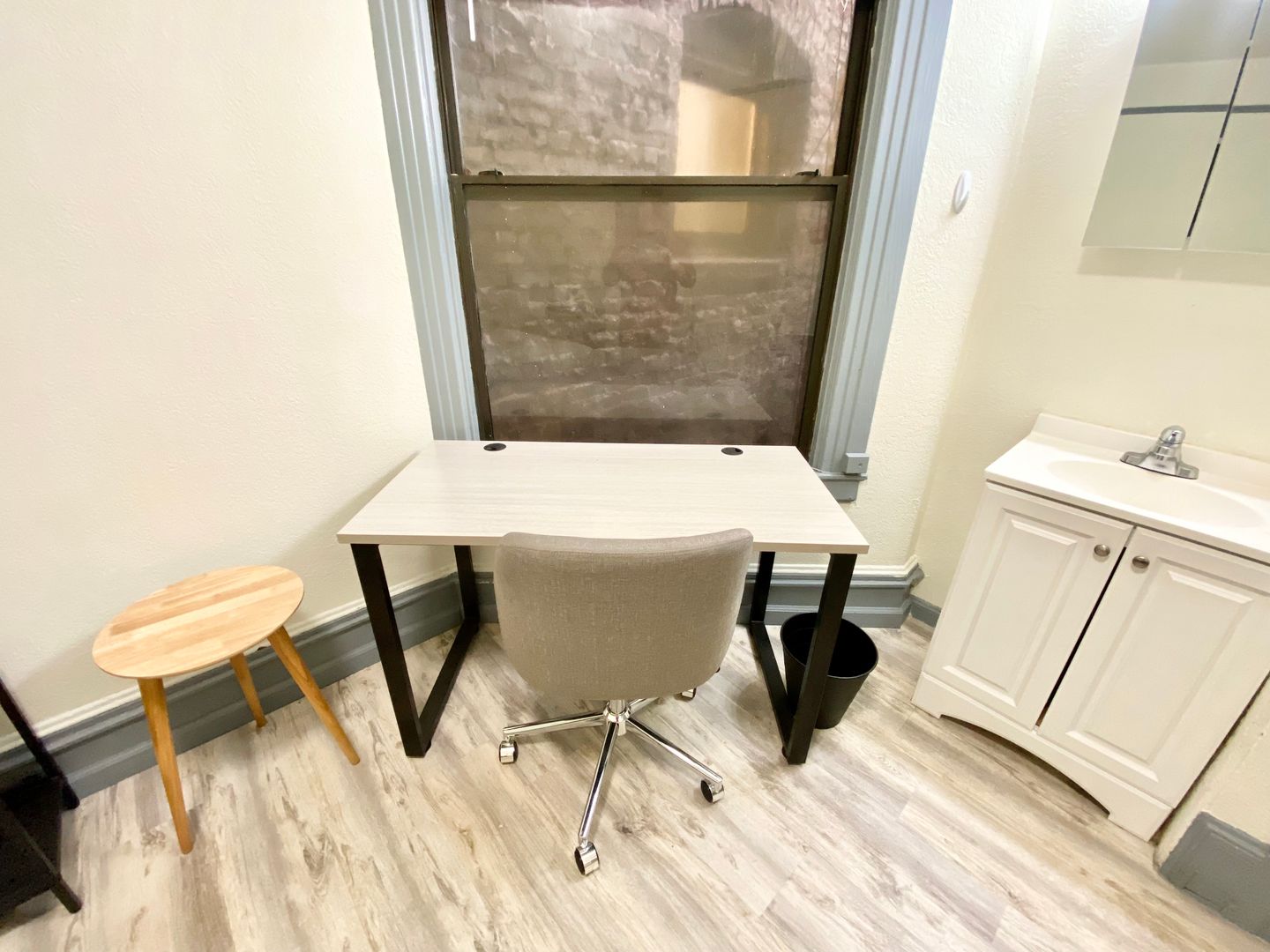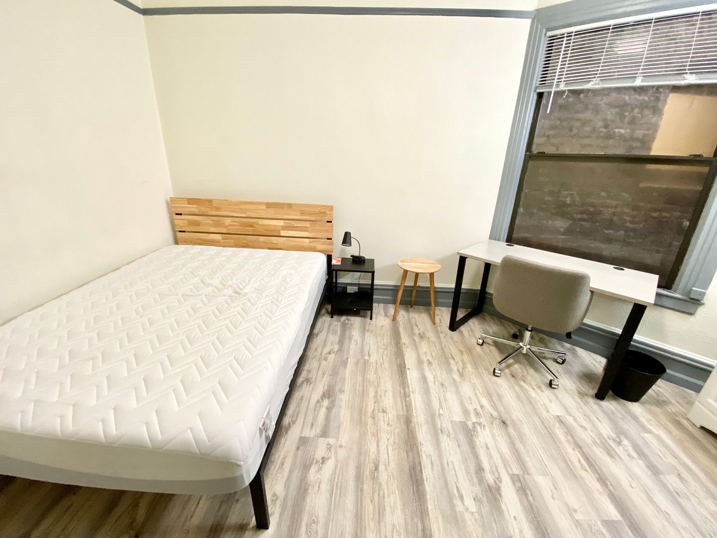 1010 Bush St., #128 is a cozy and comfortable furnished room that comes with all the essentials for the on the go person: a queen-size mattress with modern frame, nightstand, desk, chair, TV and mini refrigerator. There is also a vanity with sink, and a closet that provides storage space.