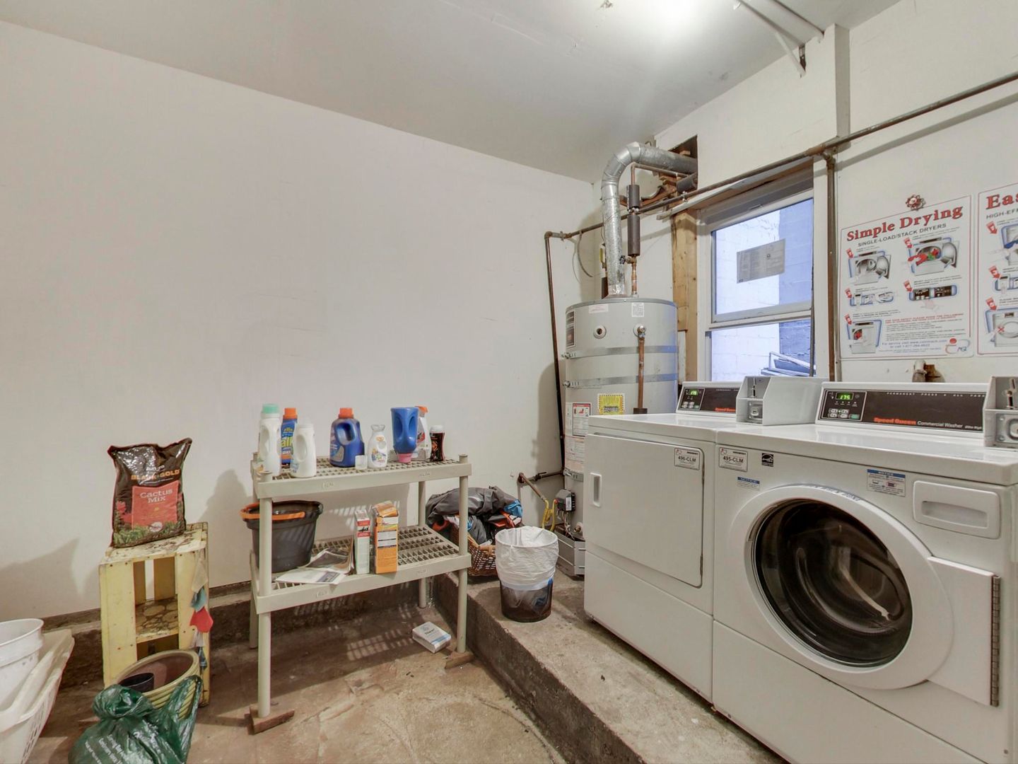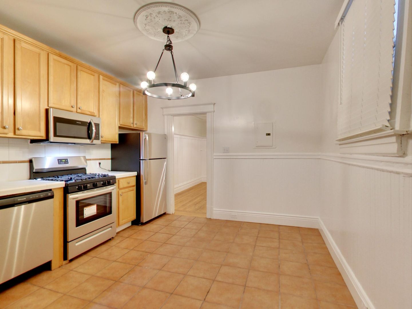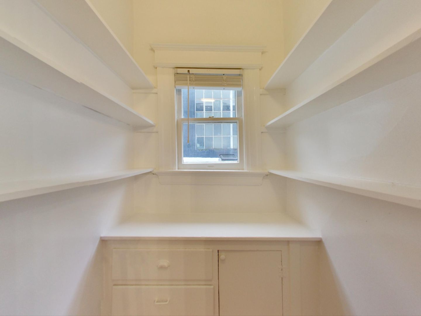 The tile floor kitchen features matching stainless steel appliances (dishwasher, gas stove/oven, refrigerator and microwave) and an abundance of cabinets, and is also large enough to accommodate a good size dining table. Just off the kitchen is the walk-in pantry with built-in shelving, drawers and cabinetry, offering tons of additional storage space. The updated, tile-floor bathroom features a tub/shower combination, as well as a classic pedestal sink. There is a small patio deck out the back of the unit, and the in-building laundry room is located just downstairs.
