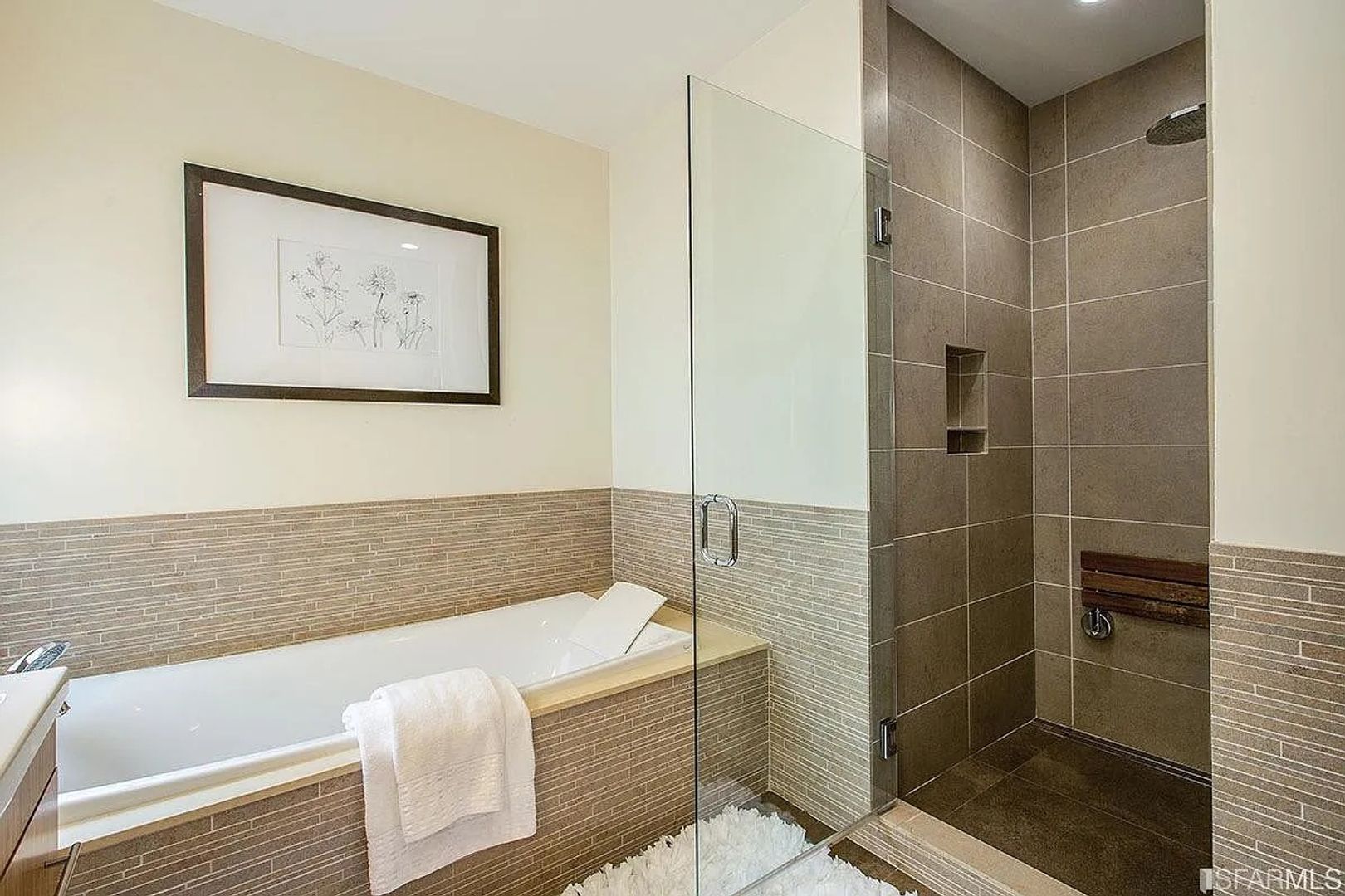 The primary suite offers a spa-like retreat with champagne soaking tub, dual-head walk-in shower, radiant heated floors, heated towel rack, and an extravagant TOTO Neorest toilet-bidet. A second bedroom with a gas fireplace and generous closet space sits across the hall from the second full bath. The versatile third bedroom is perfect as a home office, studio, or nursery.