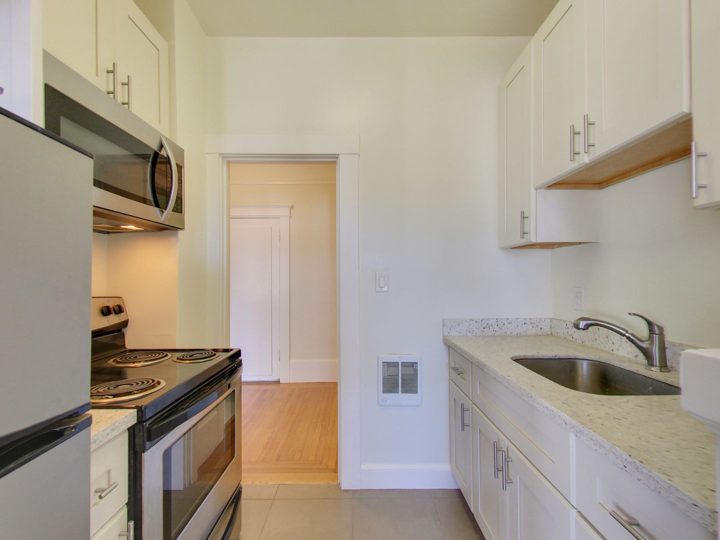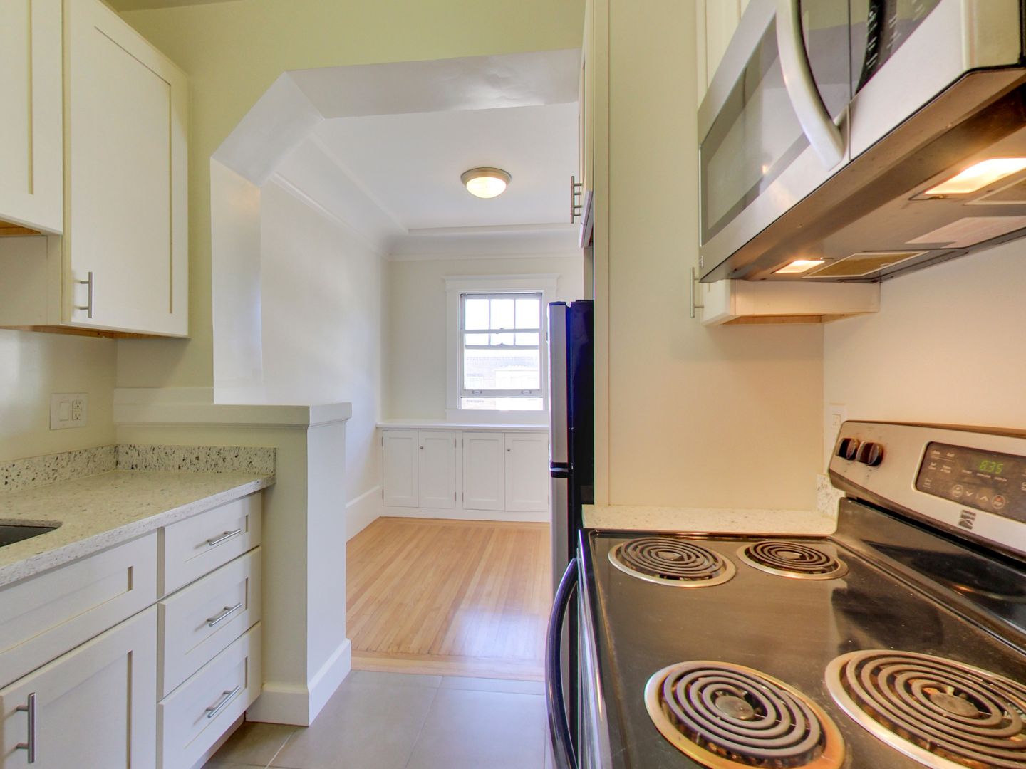 - Modern Kitchen: The kitchen is well-equipped with matching stainless steel appliances, including a gas stove/oven, refrigerator, and microwave. The addition of new grey shaker cabinets adds a modern touch and enhances storage options.